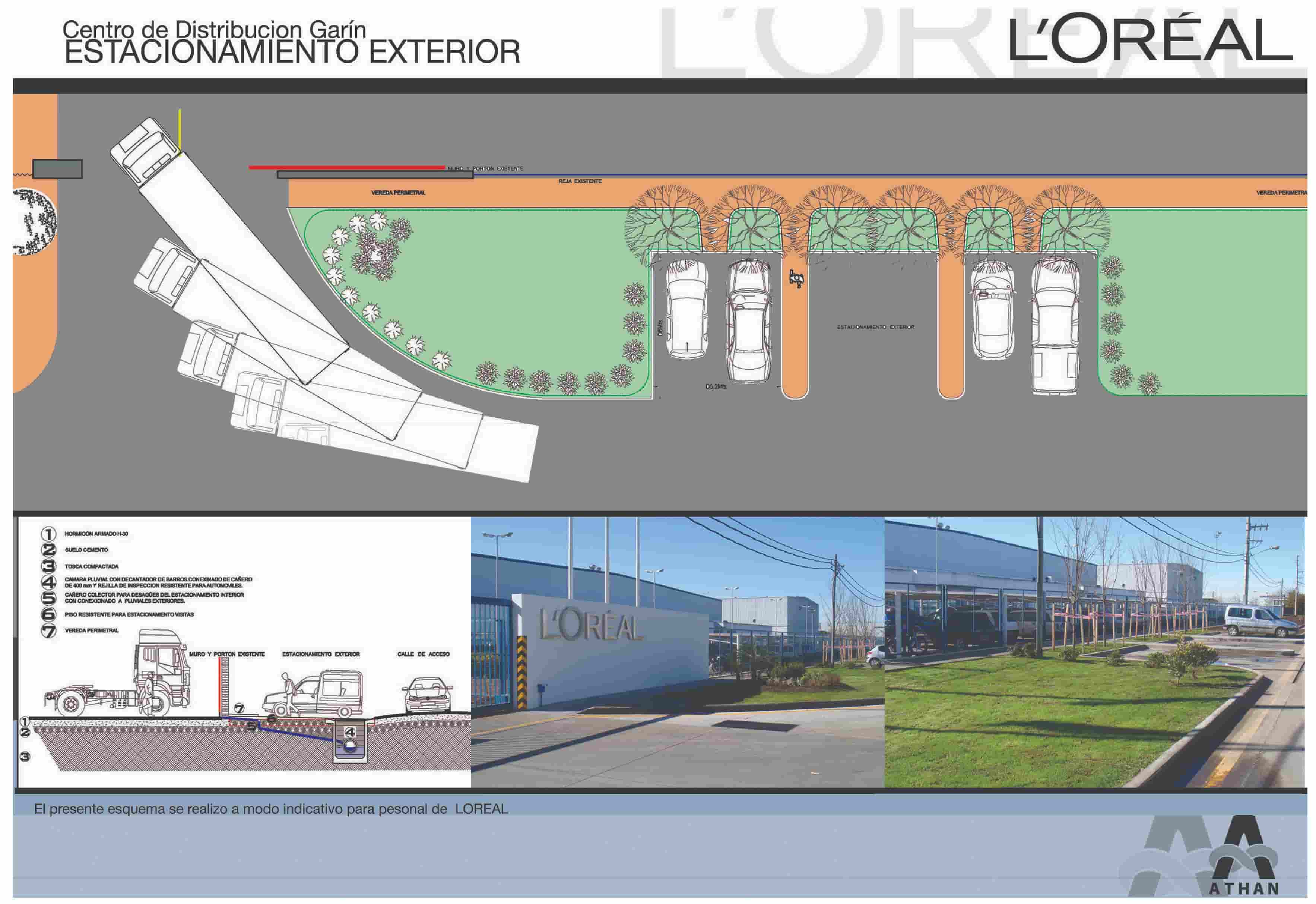 El proyecto se inició con la planificación y ejecución del nuevo acceso al Centro Logístico de L’OREAL. Las tareas incluyeron la nivelación del terreno, la pavimentación del estacionamiento de visitas con un diseño de paisajismo, y la pavimentación hasta el centro de distribución de L’OREAL Además, se llevaron a cabo trabajos de construcción de desagües pluviales y se instalo un portón automatizado para facilitar el ingreso de camiones al centro de distribución.